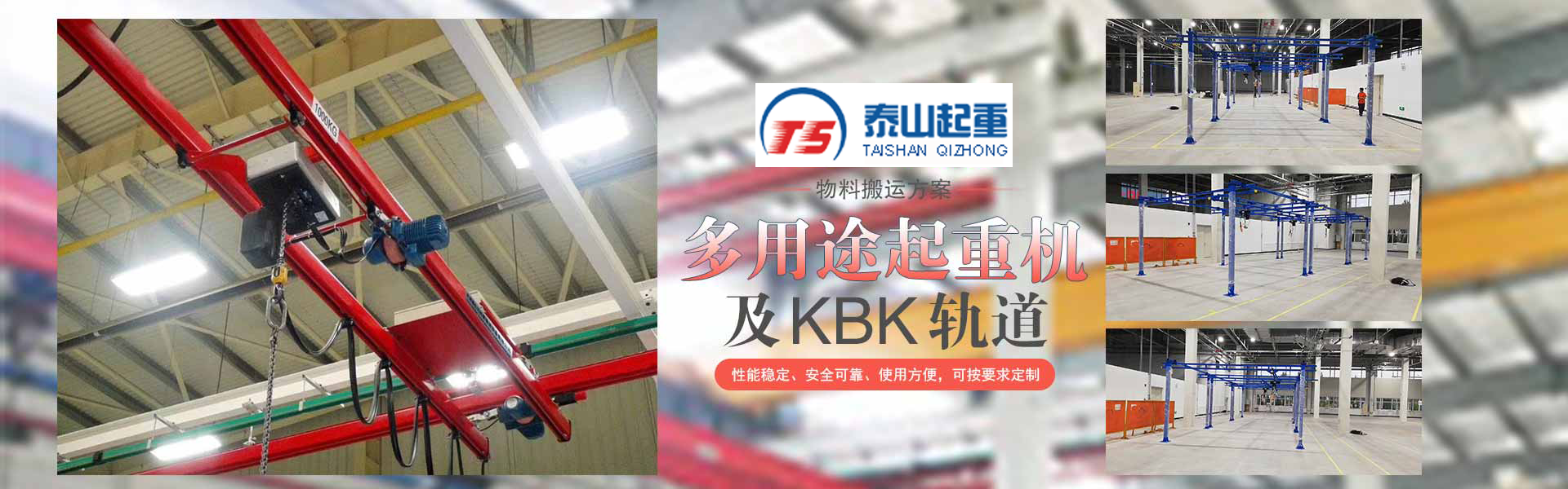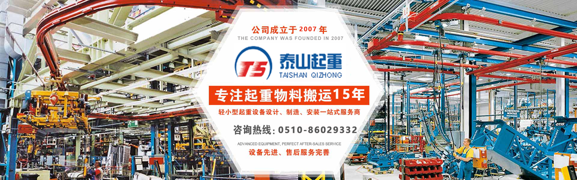 江陰市泰山起重設(shè)備有限公司座落在富庶的現(xiàn)代化港口城市——江陰市南閘鎮(zhèn)工業(yè)園區(qū),緊靠錫澄高速,錫澄路,北依江陰港區(qū),貫通滬寧高速的世界第四、中國(guó)第一的江陰長(zhǎng)江大橋,穿越而過,飛架南北,高速至上海虹橋機(jī)場(chǎng)僅2小時(shí),南又緊靠正在建設(shè)中的無錫國(guó)際機(jī)場(chǎng),交通便捷,環(huán)境優(yōu)美。  本公司專業(yè)為壁行式懸臂起重機(jī)、KBK軌道,鋼絲繩電動(dòng)葫蘆、環(huán)鏈葫蘆、KBK組件,梁式起重機(jī)、電動(dòng)旋臂起重機(jī)等配套起重機(jī)械配件,主要產(chǎn)品有:KBK軌道,梁吊掛裝置、環(huán)鏈葫蘆,KBK組件,手動(dòng)式小車、行車走輪、電纜滑車等起重機(jī)配件,同時(shí)可提供起重設(shè)備的安裝、維修、為客戶提供全方位的技術(shù)咨詢等各項(xiàng)服務(wù)。  公司的管理將“以人為本”作為宗···...